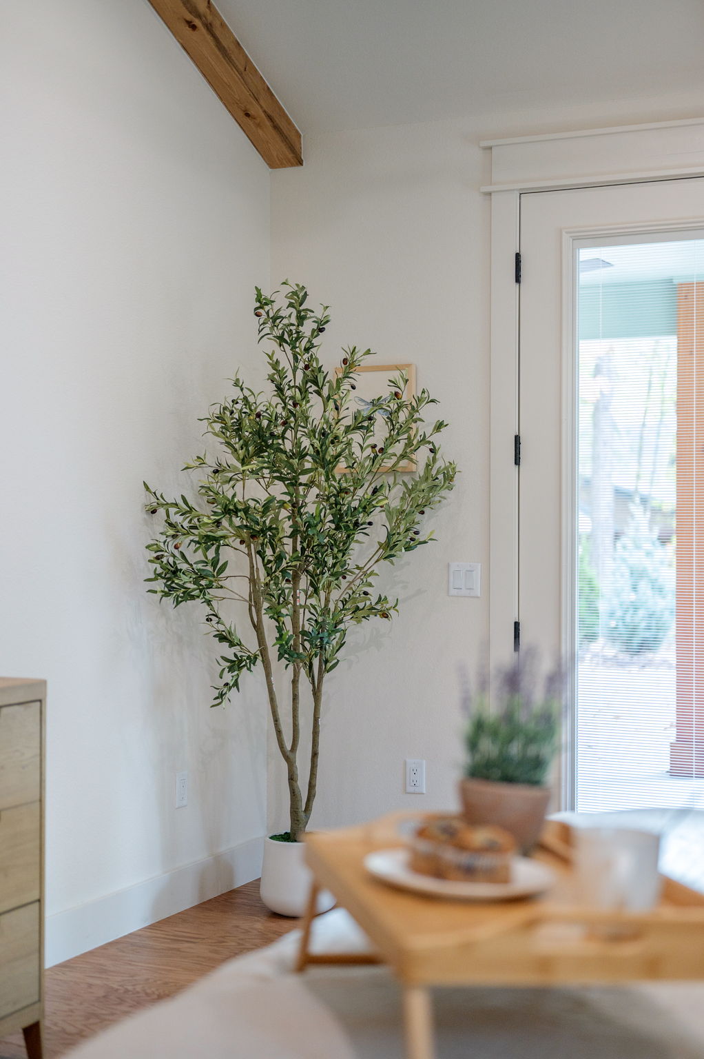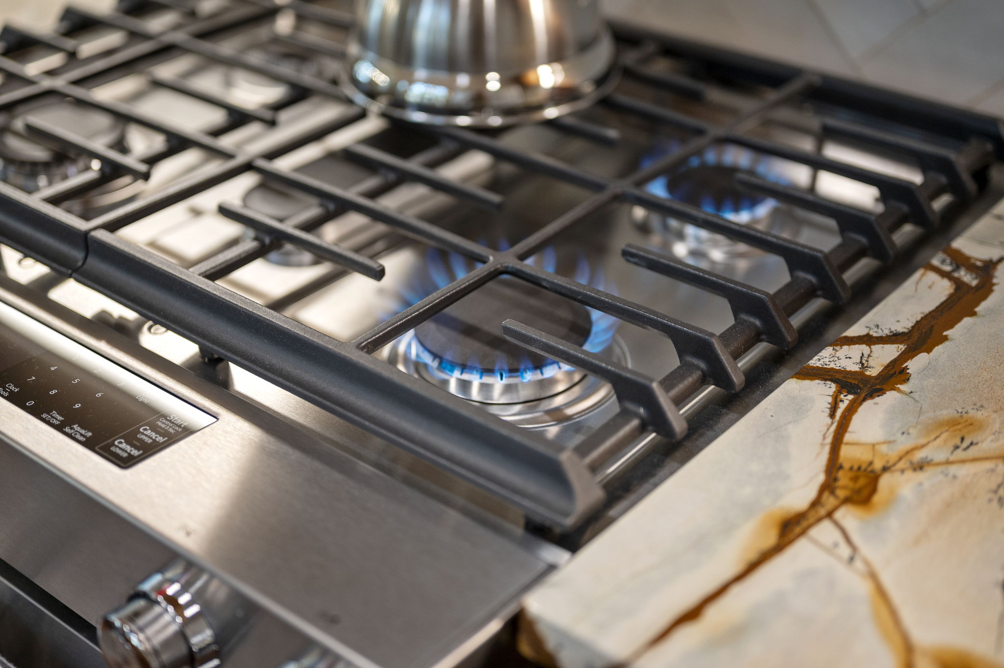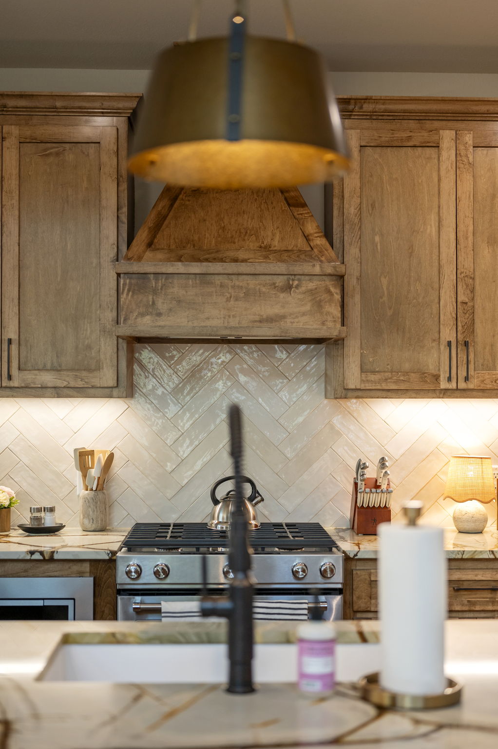 The designer kitchen features a stunning light-green stone countertop with brown veining that mirrors the surrounding pines. Fully equipped with high-end KitchenAid appliances, Henkle’s knives, cookware, and everything you need for group meals. The cabin also has provides small amenities like a coffee starter kit with sugar packets and creamer, 16 different spices, a couple of oil sprays, and even ketchup, mustard, and mayonnaise packets to make your stay even more convenient.