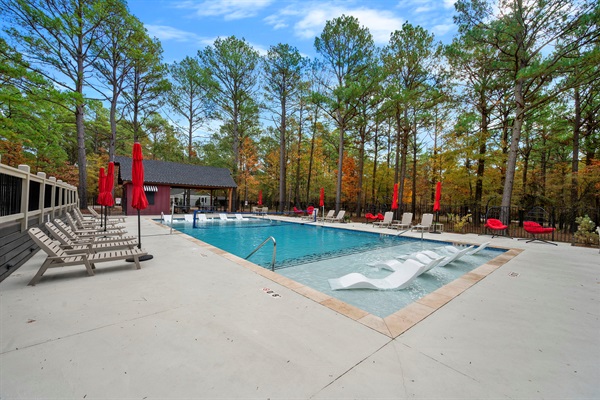 Spacious clubhouse pool area with plenty of lounge seating, shaded tables, and beautiful forest views—perfect for relaxing during your Broken Bow stay. 🏊♀️🌲✨