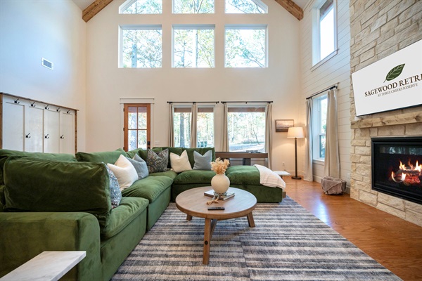 Bright windows, warm wood tones, and a cozy green sectional create the perfect retreat for connection. ✨🌲