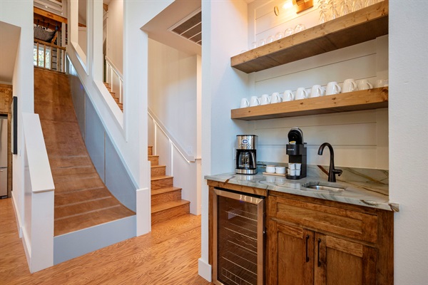 Enjoy a complete coffee setup—drip brewer, Keurig, mugs, and sink—perfect for easy mornings during your Broken Bow stay. 🌲☕